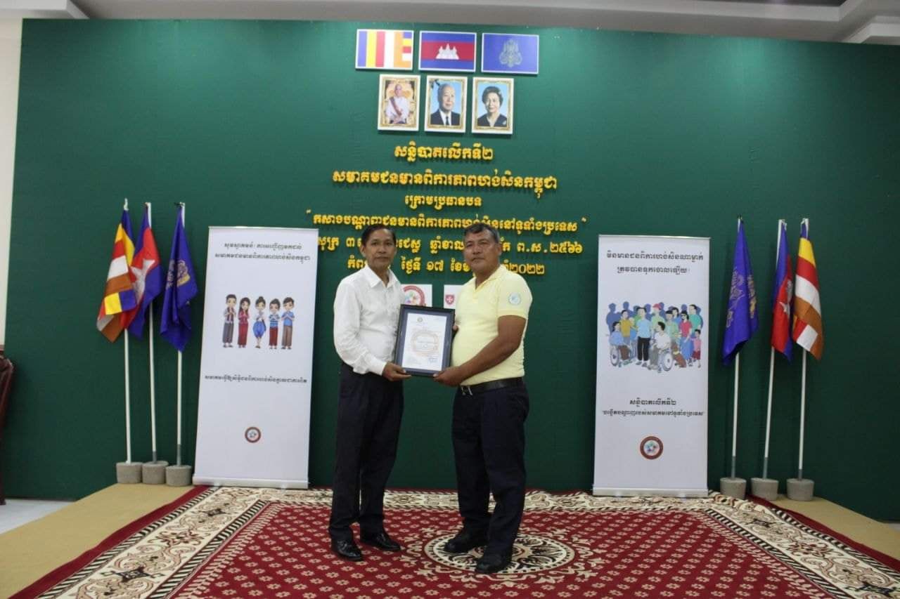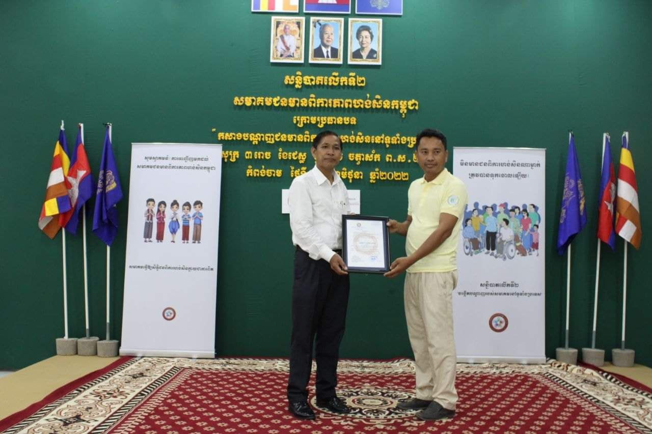 កំពង់ចាម÷ តំណាងជនមានពិការភាពមកពី២៥រាជធានីខេត្តជួបគ្នាដើម្បីបង្កើតបណ្តាញរចនាសម្ព័ន្ធរបស់ខ្លួននៅទូទាំងប្រទេសដើម្បីងាយស្រួលគ្រប់គ្រងនិងជួយគ្នាទៅវិញទៅមកដែលពិធីនេះមានសាក្សីដូចជា ១.ឯកឧត្តម ឯម ច័ន្ទមករា រដ្ឋលេខាធិការក្រសួងសង្គមកិច្ច និងជាអគ្គលេខាធិការក្រុមប្រឹក្សាសកម្មភាពជនពិការតំណាងដ្ឋមន្រ្តី ២.ឯកឧត្តម ហាន កុសល អភិបាលរងនិងជាប្រធានក្រុមប្រឹក្សាសកម្មភាពជនពិការខេត្តកំពង់ចាមតំណាងអភិបាលខេត្ត ៣.លោក ទូច វឌ្ឍនា ប្រធានមន្ទីរសង្គមកិច្ច ៤.លោកវេជ្ជបណ្ឌិត ឡាយ សម្បត្តិ អនុប្រធានកម្មវិធីជាតិនៃក្រសួងសុខាភិបាល ៥.នាយកវិទ្យាល័យអប់រំពិសេស ៦.ប្រធានសាខាមូលនិធិជនពិការ ៧.តំណាងអភិបាលស្រុកព្រៃឈរ ៨.មេឃុំមៀន ៩.មេភូមិត្រើង ១០.លោកគ្រូពេទ្យត្រើង ១១.អនុប្រធានមន្ទីរសុខាភិបាល ១២.ប្រធានមជ្ឈមណ្ឌលស្តារខេត្តកំពង់ចាម ១៣.តំណាងកម្មវិធី ACCESS ១៤.តំណាងអង្គការHI ១៥.តំណាងអង្គការជនពិការស្រុកបាធាយ ១៦.តំណាងសមាគមពេទ្យព្យាបាលដោយចលនា ១៧.តំណាងអង្គការជនពិការស្រុកត្បូងឃ្មុំ ១៨.តំណាងអង្គការជនពិការខេត្តក្រចេះ ១៩.តំណាងវេទិការស្រ្តីពិការ ២០.ទូរទស្សន៍ EAC ២១.ទូរទស្សន៍ TVK ២២.ទូរទស្សន៍បាយ័ន ២៣.ទូរទស្សន៍ហង្សមាស ២៤.ទូរទស្សន៍ PNN និង ២៥.ទូរទស្សន៍ CNC សរុប១៣៥នាក់។